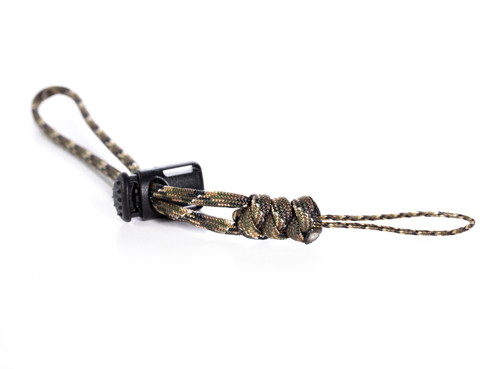 The Lanyard is constructed from 550 Paracord and Microcord, consisting of a main paracord wrist loop with a plastic cord lock to tighten to the wrist, and a microcord lanyard attachment loop to hitch through the release's attachment point. Tough enough for multiple days busting brush, and so light (0.2 ounces) you'll forget you're wearing it. With no excess length to snag on anything, it's as equally at home in the tree stand as it is on the mountain. Designed for hunting, with nothing extra to get in the way or fiddle with in the moment of truth, the minimalist design is also perfect for the 3D range.